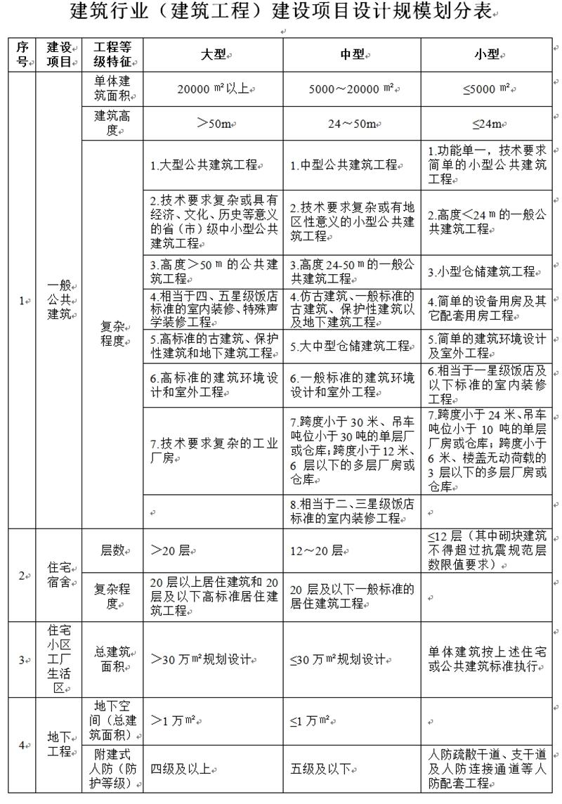建筑行業(yè)(建筑工程)建設項目設計規(guī)模劃分表